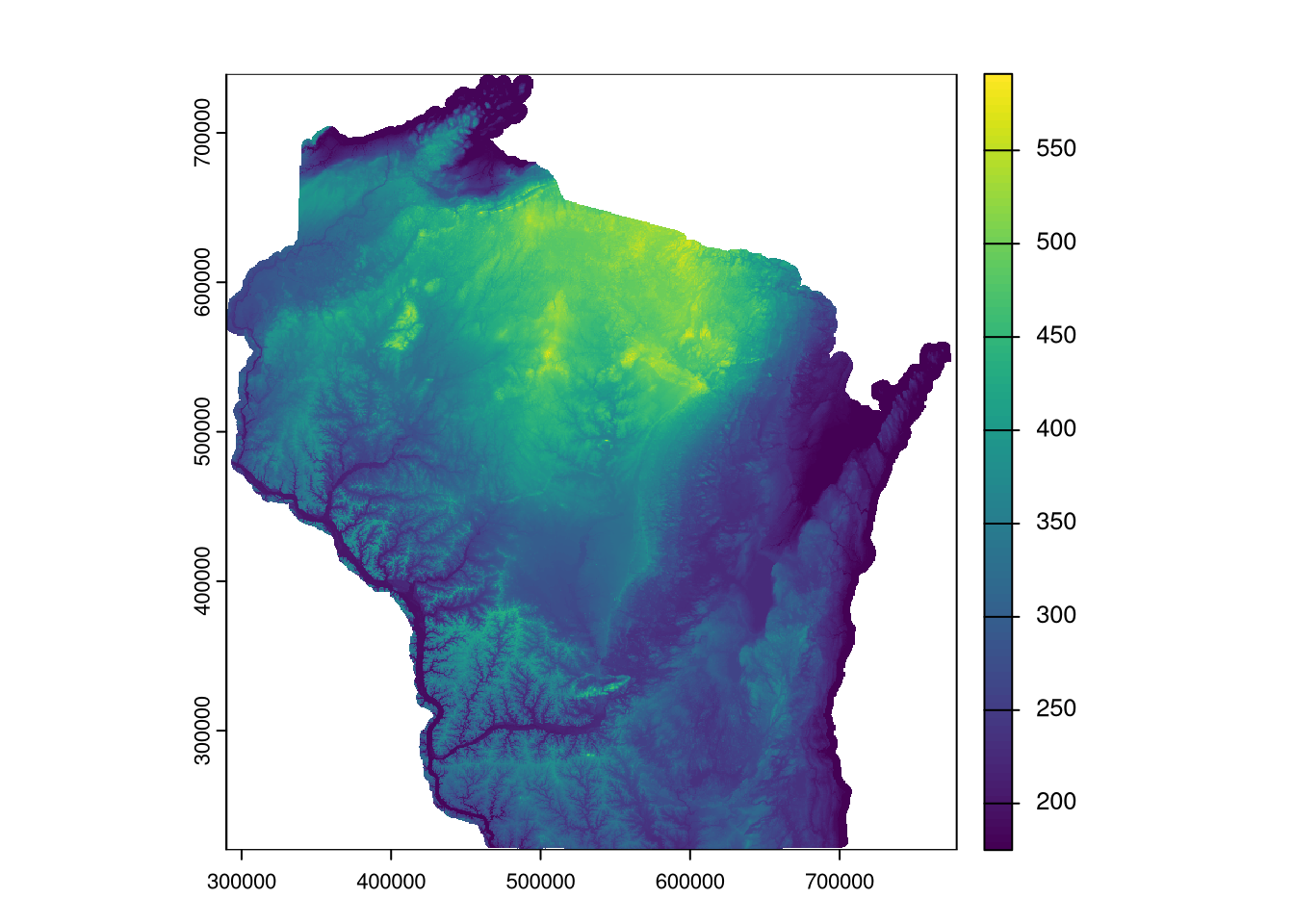 wi_dem <- rast(here("data-raw/DEM_30m/demgw930"))We can create a quick plot to verify the dataset with the plot method: